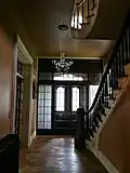 The vestibule is a small space approximately 16 feet square. It's the first space encountered upon entering the home and is separated from the foyer by a double-door. The foyer contains access to the main staircase with a large carved newel post made from cherry and Birds-Eye Maple. The staircase and landings are cantilevered above the first floor and feature a continuous varnished maple railing supported by 102 turned spindles.
