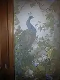 The second parlor, also known as the "drawing room" or "ladies salon" features white wallpaper depicting gnarled trees and fanciful scenes. It contains a large white tile fireplace and mantle straddled by ornately carved wooden griffons.
