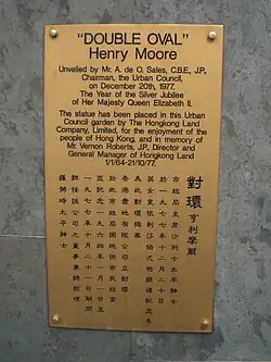 The focal point of the square is a sculpture by English artist Henry Moore titled Double Oval, one of two casts from a 1966 mould. Upon its unveiling in December 1977, it was dedicated to Vernon Roberts, former director and general manager of the Hongkong Land company, who had died on 21 October of that year.[4]