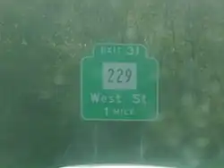 Route 229 nominally begins at the end of the eastbound Exit 31 off-ramp of I-84 in western Southington, heading northward along West Street.[2] State maintenance and the official southern end of Route 229 begins about 0.01-mile (0.016 km) south of the off-ramp.[1] West Street is four lanes wide in the vicinity of the I-84 interchange, then becomes a three lane (two lanes northbound, one lane southbound) urban arterial as it heads north. Just south of the Bristol town line, Route 229 shifts to Middle Street and becomes four lanes wide.[1][2]