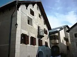 Könz's sgraffito work can be found all over Graubünden. For instance, groups of houses in the villages Bever, Pontresina, La Punt Chamues-ch, and Ftan and detached houses in the alpine valley regions Engadin, Münstertal, and Albulatal.[1] Könz's murals and paintings can also be seen in public buildings such as schools, courthouses, and banks.[1] Traditional motives are most common in Könz's murals and paintings, but some works feature religious motives. An example of the latter is the three stained glass windows in the church San Luzi in Zuoz. They are called La Cretta (1987), Lebensbaum und lebendiges Feuer (2009), and Sabbatruhe (2010).[5][6]