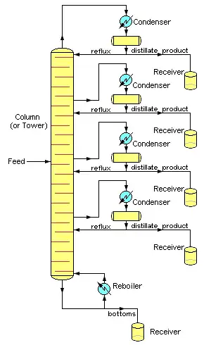 Image 4: Simplified chemical engineering schematic of Continuous Fractional Distillation tower separating one feed mixture stream into four distillate and one bottoms fractions