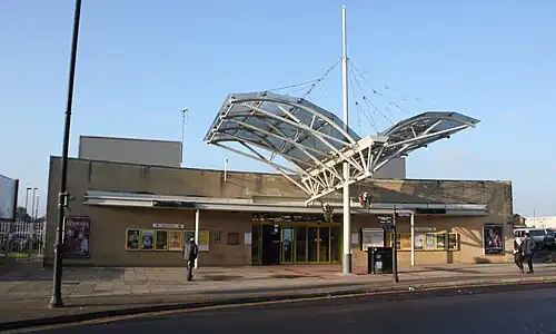 Conway Park is the newest station on the Wirral Line. In 1990, the Merseyside Development Corporation joined with British Rail and Merseyrail to study the cost of the new station.[1] The station opened to the public on 22 June 1998,[2] after an official opening by Neil Kinnock on 24 April 1998.[3][4] Conway Park is between Birkenhead Park and Hamilton Square stations built into an underground tunnel built by the Mersey Railway in the 1880s. It was built by excavating a box downwards, opening out the roof of the tunnel, which is 18 m (59 ft) below ground level. The platforms are reached by stairs or lifts from the ticket office.[5]
