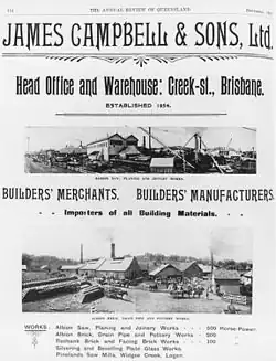 James Campbell had a sawmill in Creek Street, Brisbane. Logs were cut in the Blackall Range and upper Caboolture River and hauled to Mellum Creek from where they were rafted down the Pumicestone Passage to the Creek Street sawmill. In 1881, James Campbell decided to establish a sawmill on the Coochin Creek near the confluence with Mellum Creek, from where the sawn timber was transported to Brisbane, initially via sailing cutter and from 1883 by paddlesteamer.[9][10]