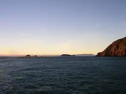 The strait is named after James Cook, the first European commander to sail through it, in 1770.[4] The waters of Cook Strait are dominated by strong tidal flows. The tidal flow through Cook Strait is unusual in that the tidal elevation at the ends of the strait are almost exactly out of phase with one another, so high water on one side meets low water on the other. A number of ships have been wrecked in Cook Strait with significant loss of life, such as the Maria in 1851,[5] the City of Dunedin in 1865,[6] the St Vincent in 1869,[5] the Lastingham in 1884,[7] SS Penguin in 1909[8] and TEV Wahine in 1968.