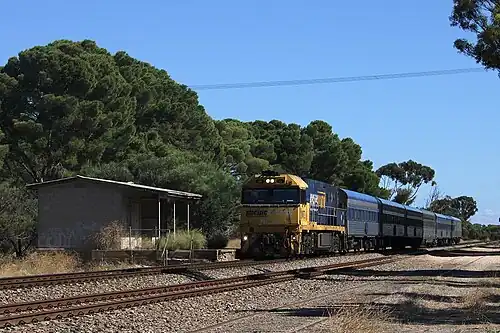 ![]() The Overland passing the railway station at Coomandook, April 2023 | |||||||||||