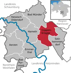 Coppenbrügge (German pronunciation: [kɔpn̩ˈbʁʏɡə]) is a municipality in the Hamelin-Pyrmont district, in Lower Saxony, Germany. It is situated approximatively 15 km (10 miles) east of Hamelin.