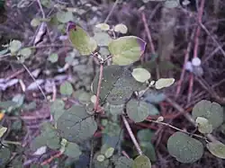 The Maori name for the small-leaved, divaricating forms of coprosma is mikimiki.[1] The word Coprosma originates from the Greek kopros meaning "dung" and osme meaning "odour", because some Coprosma species smell like dung. The word rotundifolia originates from two Latin words: rotundus meaning "round" and folium meaning "leaf".[2]
