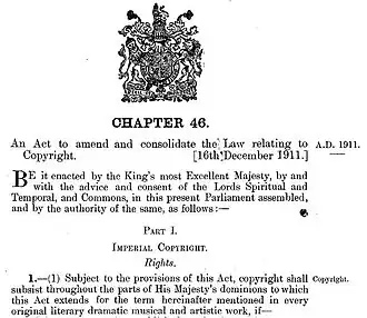 The Copyright Act 1911 (1 & 2 Geo. 5. c. 46), also known as the Imperial Copyright Act 1911, was an act of the Parliament of the United Kingdom which received royal assent on 16 December 1911.[2] The act established copyright law in the UK and the British Empire. The act amended existing UK copyright law, as recommended by a royal commission in 1878[3] and repealed all previous copyright legislation that had been in force in the UK.[4] The act also implemented changes arising from the first revision of the Berne Convention for the Protection of Literary and Artistic Works in 1908.[4]