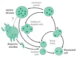 - ^ Ruiz-Trillo, Iñaki; Donachie, Stuart; Sitjà-Bobadilla, Ariadna; Roger, Andrew J.; Paley, Richard; Nichols, Krista M.; Whipps, Christopher M.; Pérez-Cordón, Gregorio; Eme, Laura (2015-09-21). "Phylogenomics Reveals Convergent Evolution of Lifestyles in Close Relatives of Animals and Fungi". Current Biology. 25 (18): 2404–2410. doi:10.1016/j.cub.2015.07.053. ISSN 0960-9822. PMID 26365255.