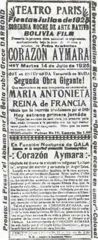 Jeff Himpele, in Circuits of Culture: Media, Politics, and Indigenous Identity in the Andes, places Corazón Aymara in the context of the Bolivian state's "indigenist project" of the 1920s and 1930s. Corazón Aymara, like José Maria Velasco Maidana's Wara Wara (1930), served as a "visual register of the modernization of the nation state"[4] - thus, according to José Antonio Lucero of the University of Washington, "narrating a future of synthetic mestizo nation building". Lucero also notes that indigenous characters in the cinema of the time were orientalised and played by non-indigenous actors and actresses.[5]