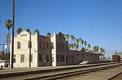The current station building, opened in 1999, replaced a former Atchison, Topeka and Santa Fe Railway depot from 1907 that was demolished in 1998.[4] It exhibits Spanish Revival style architecture that includes decorative curvilinear gables and stuccoed walls. The depot is decorated with a large bas-relief called “Life of the Valley" depicting the importance of water to the residents, agriculture, and wildlife of the San Joaquin Valley.[4] Artist Garrett Masterson completed it with the help of his students at the nearby California State Prison, Corcoran.[4]