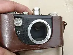The camera back is removable for changing film. A milled button next to the tripod socket rotates either way to lock the back, while in a position in between it is unlocked. The back comes off downwards as a single unit including the base-plate. The film-pressure plate of thick glass is mounted on a piece of rubber foam on the back. Inside the camera, on the left-hand side, is the 35mm film cassette chamber, and to the right is the counter clockwise rotating film take-up drum. It has a narrow slit for the film leader, and it rotates freely whenever the small film rewind button on the top plate is depressed. No sprocket wheel is employed; instead, the film is pulled by, and wound onto the drum that always rotates the same angular amount for next picture frame. Acceptable frame spacing is accomplished by the large diameter take-up spool that reduces the effect of increasing spool diameter as more film is wound onto it.[6][7][8]