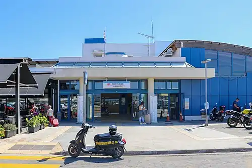 Corinth railway station (Greek: Σιδηροδρομικός Σταθμός Κορίνθου, romanized: Sidirodromikós Stathmós Korínthou) is a station[5] in Corinth in the northern Peloponnese, Greece. It was opened on 27 September 2005, replacing an older station near the harbour. The new station is located 2.9 kilometres (1.8 mi) from the town centre on the outskirts of the city, near Examilia near the A8 motorway between Athens and Patras. The station is served by the Athens Suburban Railway between Piraeus and Kiato.[6] It should not be confused with the now-closed station Corinth railway station, which is located northeast of the current station, closer to the coast of the Corinthian Gulf.