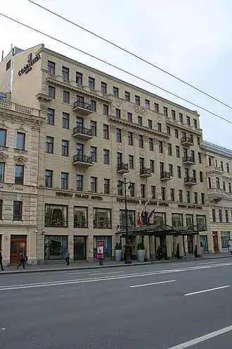 The Corinthia Hotel St. Petersburg, formerly the Nevskij Palace Hotel (known in Russian as Невский Палас), is a five-star hotel in Saint Petersburg, Russia. It is located on Nevsky Prospect about 800 meters from the Moscow railway station.[1]