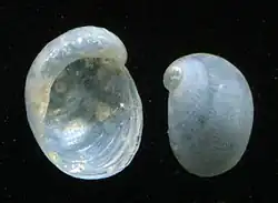 C. nigra has an internal and reduced shell, and spirally rolled radula, as have all the members of the family Velutinidae.[13] The shell is conchinous and it has 2½ or three whorls.[14][4] Whorls are expanding rapidly and the last whorl cover four fifths of the shell height. The color of the shell is translucent white. The shell is smooth with irregular growth lines. The aperture is large.[14] Shell width is 6.3 mm (for a shell length of 10 mm). Shell length varies from 10 mm to 30–40 mm.[4][23]