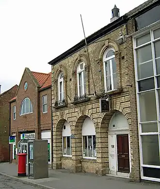 The building was designed by D. W. Aston of Kingston upon Hull, built by Willford & Dinsdale in yellow gault bricks at a cost of £1,000 and was officially opened in February 1854.[4][5] The design involved a symmetrical main frontage of three bays facing onto the Market Place. The ground floor, which was rusticated, featured three round headed openings with voussoirs and keystones, while the first floor was fenestrated by round headed casement windows flanked by short Corinthian order pilasters supporting architraves and keystones. There were quoins at the corners and, at roof level, there was a cornice, supported by paired brackets, and a Welsh slate roof. Internally, the principal rooms were the market hall on the ground floor and a reading room on the first floor.[1]