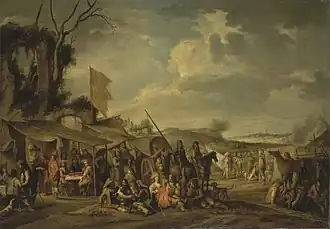 He collaborated with van Dyck as well as with other Flemish artists such as the landscape painter Jan Wildens.[15] Collaborations with local artists were also frequent. De Wael or someone from his circle painted the staffage in the landscapes of the Italian landscape painter Giovanni Battista Vicino.[5][9] In many of his battle scenes and harbour views his brother Lucas painted the landscapes while Cornelis in turn added the figures to Lucas' paintings.[16]
