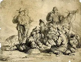 He also left many drawings some of which are in the collections of the Louvre and the British Museum. The British Museum holds an album of 53 drawings dating from 1640 to 1650 which covers mainly military subjects.[17] These drawings are generally direct and are often signed or inscribed.[9] Many of his religiously themed drawings were turned into prints by his nephew Jan Baptist de Wael.[18] The Antwerp engraver Melchior Hamers frequently engraved after the designs of de Wael. The Antwerp engraver and publisher Alexander Voet the Elder published engravings made after designs by de Wael such as the series of the Four Seasons and the Five Senses.[2] De Wael also engraved his own prints. The British Museum holds a series of 19 prints depicting genre scenes published by Martinus van den Enden the Elder in Antwerp.[19]