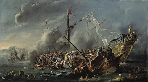 Cornelis de Wael was a specialist painter of battle scenes. A number of these paintings depicting battles on land (such as the Siege of Ostend, in the Museo del Prado) and sea (such as the Battle between Christians and Turks, in the Museo Poldi Pezzoli) have survived. The broad composition of some of his military works is close to that of the leading Flemish war artists Pieter Meulener and Adam Frans van der Meulen while their static quality recalls the work of Sebastiaen Vrancx.[9]