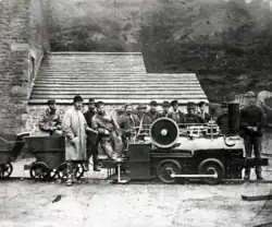 The mine was connected by a 1 mile (1.6 km) long 1 ft 10 in (559 mm) gauge light railway to Whitfield Brow.[7] The mine's steam locomotive Samson was built by Stephen Lewin of Poole in Dorset in 1874 as an 0-4-0G steam locomotive.[8][9] It had power of 2½ or 3 nhp and a loaded weight of 2.6 t.[10][11] Its footplate provided just enough space for the engineer, who could sit on the rear buffer beam, as known from its even smaller sister locomotives 'Ant' and 'Bee' of the Great Laxey Mine.[12] The locomotive was probably scrapped around 1904.[7]