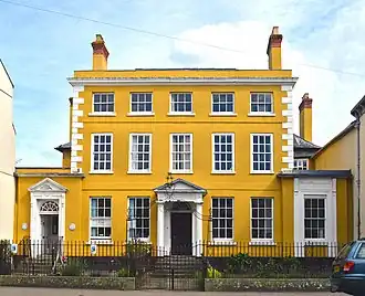 The building now faces Monnow Street. The façade that looks onto the street is Georgian and shows two floors and an attic, with the building being set behind a railed forecourt. The new frontage was added in 1770, and (slightly later) a porch, fanlights and side doors were added in the late 18th century.[2] The house now has five bays, under a cornice and pedimented porch on slender Doric columns.