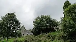 Inchiquin Castle is located just outside the town, on the north side of Lake Inchiquin. It was possibly begun by Teige-an-Chomhaid O'Brien (d. 1466). In 1542, it belonged to Turlough, son of Murrough, first Baron of Inchiquin. Murrough O'Brien, the fourth Baron, was in possession in 1580. His descendants, the Marquesses of Thomond, derived their title of Earl of Inchiquin from this estate. During the Nine Years' War, Hugh Roe O'Donnell raided Clare and Inchiquin Castle was attacked by one of his lieutenants, Maguire of Fermanagh. During the Confederate Wars Christopher O'Brien, Murrough the Burner's brother, lived here. Murrough's son, Colonel John O'Brien, abandoned Inchiquin towards the end of the 17th century. By then it had deteriorated into a ruin. Today the castle remains a ruin surrounded by pastures. Part of the older castle tower is still extant as is a good portion of the later 17th-century banquet hall.[6]