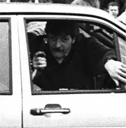 Derek Tony Wood, aged 24, and David Robert Howes, aged 23, were corporals in the British Army's Royal Corps of Signals. According to the British Army, Wood and Howes ignored general orders to stay away from the area where the funeral was being held.[9] It has been presumed that the two men accidentally drove into the procession.[5][10] Howes had arrived in Northern Ireland one week before. Soldiers and police officers suggested that the corporals had gone "wandering", and that Wood was showing his newly arrived colleague the republican districts of Belfast.[11] Former British soldier Seán Hartnett stated the corporals were members of the Royal Corps of Signals attached to a military surveillance unit known as the Joint Communications Unit (JCU).[12]