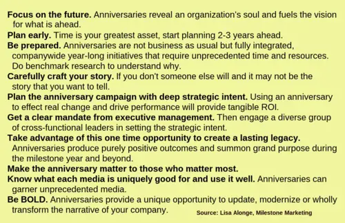 An anniversary can advertise a firm's staying power and longevity. A report in The New York Times explained the marketing logic: