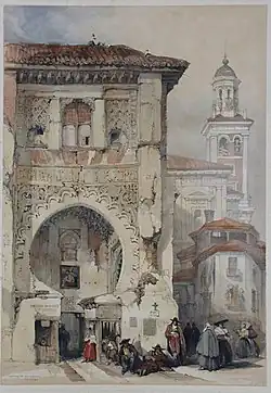 It was located next to the city's central bazaar, the qaysariyya (known today as the Alcaicería), which in turn was located next to the city's Great Mosque (its main Friday mosque), occupied today by the Cathedral.[4] A small bridge, called al-qantarat al-jadida ("new bridge") until 1501 and later Puente del carbón or Puente del Álamo or Puente de los Curtidores (Qantarat al-Dabbayin), was located on the Darro River and linked the building with the bazaar.