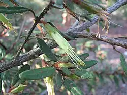 Correa calycina, commonly known as the South Australian green correa[2] or Hindmarsh correa,[3] is a species of tall, dense shrub that is endemic to a small area of South Australia. It has papery, oblong leaves and pendulous green flowers arranged singly on the ends of short side branches.