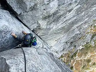 • Pitch 3: It ascends through another chimney, then traverses past a piton an onto an exposed arete.[4]