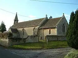 There may have been a church on this site in the 12th century.[5] The present building has a 15th-century bell-turret with a short spire – described by Pevsner as "impressive"[6] – but the rest was rebuilt in 1881 in coursed rubble with stone dressings; the chancel is from 1911. Inside is a 15th-century rood screen and a 17th-century oak pulpit.[4]