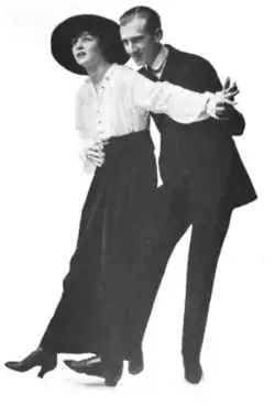 This step in New York is called 'Skating'. It seems to be a very good name for it, as the position you take is exactly the same as that taken by skaters when they are skating side by side. You get into the step in this way: When we left off, we were doing the Two Step. Now, if the gentleman will do a single step and still keep his partner doing a Two Step, he will find that she turns around so that she is side by side with him. As soon as she is in this position, and he finds that he is on the same foot as she is, that is, in step with her, he resumes the Two Step down the room (but he is naturally at the side of her instead of in front).