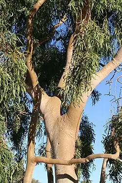 Corymbia blakei is a tree that typically grows to a height of 10 metres (33 ft) and forms a lignotuber. It has smooth, powdery white to creamy grey bark, with a short stocking of rough, tessellated, dark grey bark at the base of older specimens. Young plants and coppice regrowth have heart-shaped, egg-shaped or elliptical leaves that are 20–60 mm (0.79–2.36 in) long and 10–30 mm (0.39–1.18 in) wide. Adult leaves are the same shade of green on both sides, linear, narrow lance-shaped or curved, 40–130 mm (1.6–5.1 in) long and 3–18 mm (0.12–0.71 in) wide, tapering to a petiole 3–17 mm (0.12–0.67 in) long. The flower buds are arranged in leaf axils on a branched peduncle up to 2 mm (0.079 in) long, each branch usually with three buds on pedicels 1–4 mm (0.039–0.157 in) long. Mature buds are pear-shaped, 4–5 mm (0.16–0.20 in) long and 3–4 mm (0.12–0.16 in) wide with a rounded operculum. Flowering has been recorded in December and the flowers are creamy white. The fruit is a woody barrel-shaped, cup-shaped or cylindrical capsule 6–10 mm (0.24–0.39 in) long and 5–9 mm (0.20–0.35 in) wide with the valves enclosed in the fruit.[2][3]