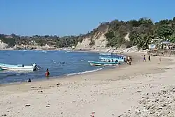 Generally tourist facilities are very basic and rustic. Food service, generally under palapas, open-air restaurants with thatched roofs, is common, but accommodations are sparse. One change to encourage tourism was to replace many speed bumps on Highway 200 and other major roads with devices that make the car vibrate instead to control speed. These roads are now also regularly patrolled by the Mexican federal police, which has been trying to control an increased incidence of highway robbery.[25] Chautengo is a large lagoon in the Cruz Grande municipality. Most economic activity is based on fishing, but there are some palapas and food service at the Pico del Monte beach, which is next to where the lagoon opens to the sea.[25][6] La Bocana is a long beach facing open ocean with a small navigable estuary where the Marquelia River empties into the Pacific Ocean. The area is filled with palapa restaurants as the beach is popular with locals. La Peñitas has two small bays facing the ocean, and one mostly closed off and protected by a strip of land. Accommodations in small bungalows is available along with restaurants. Barra de Tecoanapa is next to the mouth of the Quetzala River. It has beaches facing the ocean. Playa Ventura is in the municipality of Marquelia. This is a small bay facing open ocean with a long beach and medium waves. Unlike other beaches in the area, this is relatively developed with houses, restaurants and hotels made of cinderblock and concrete, painted in bright colors. Hotel services are basic and camping is permitted.[25]