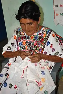 There is important traditional textile production among the Amuzgos, along with ceramics, leather, cheese and piloncillo. Most surplus products are sold in Ometepec. Traditional weaving is done on a backstrap loom, and girls learn the process starting from when they are about six or seven years old. The most traditional garments are made from a local cotton called coyuche, which is grown, cleaned, spun, dyed then woven. The most notable and time-consuming garment is the women's huipil, which has, at times, very complicated designs woven into it. A number of Amuzgo weavers have been recognized for their work, including Florentina López de Jesús. Many Amuzgos in Guerrero still wear traditional garments, with men wearing loose white cotton pants and shirt and the women wearing a huipil and dress. However, those made with commercial cloth are becoming more common.[3]
