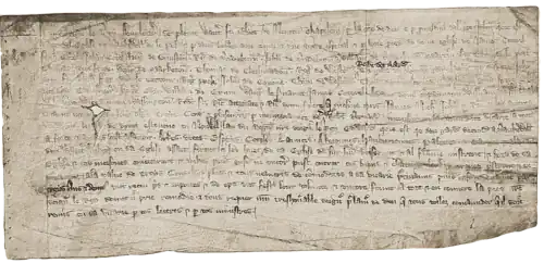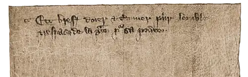 This was the gang's method with the mayor of Nottingham, to whom they wrote demanding £20—"or else".[61] They used the indenture system:[note 13] one half of the indentured contract was sent to the victim with the demand, and the sum demanded was to be paid to whoever arrived at the appointed time bearing the other half of the indenture.[58][note 14] This seems to have been a particular speciality of two members, William Pymme of Sutton Bonington and Roger Sauvage,[16] and one of the bearers they used in 1332 to carry such a letter to William Amyas, a wealthy Nottingham ship owner, was Pymme's mother.[44] In direct imitation of royal justice, they demanded tribute from the local populace;[65] William Amyas was told that, if he failed to comply, "everything he held outside of Nottingham would be burned".[44] On another occasion they went, mob-handed, to the house of Robert Franceys, where they forced him to hand over £2; Fraunceys, so a chronicler wrote, was sufficiently scared by his experience that "he left his house and did not return for a long time".[66] A Bakewell man, Ralph Murimouth, was forced to hand over £5.[59]
