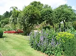 The Walled Garden was originally a kitchen garden, the area now houses the marmosets and tamarins, contained cold fruit frames full of parma violets and other delicate plants, and on the site of the gardeners' greenhouse stood two structures reputed to be the oldest greenhouses in Oxfordshire.[7] The Tropical House has taken the place of three adjoining greenhouses, the first for carnations, the second for rare hot-house plants and a fig tree, and the third for nectarines and peaches. The water supply for the Walled Garden came from a central well now covered over but still marked. There was a cricket pitch on what is now the grass car park, and two grass tennis courts outside the drawing room and brass-rubbing room. Many years ago, there was even a private nine-hole golf course covering what is now the ostrich enclosure and surrounding area.