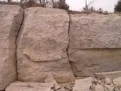 A regionally famous construction material, Cottonwood Limestone is yellowish, buff, to nearly white in color, even-textured, durable, and very suitable for cutting into dimensional stone for masonry. Moreover, its beds of usable stone are particularly massive for the region; blocks of stone three or more feet thick and several feet in length and width can be taken from a ledge.[9] While many other limestone formations are found in the region and have been widely used in local construction, most (excepting most notably the Fort Riley Limestone[10]) weather poorly, lie with much thinner parting beds, or are generally much higher in the typical Permian silica or flint content and so are much more difficult to cut or sculpt.[5] As such, the lithologic characteristics of Cottonwood Limestone has made it one of the best building stones in the state and many past quarries, large and small, may be found on nearly every hill capped by this resource.[4]