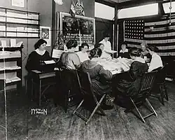 In April 1917, suffragist, Anna Howard Shaw, founded the Women's Committee of the Council of National Defense.[11] The committee was initially made up of Shaw, Carrie Chapman Catt, Maude A. K. Wetmore, Ida Tarbell, Mrs. Joseph E. Cowles, Antoinette Funk, Mrs. Phillip N. Moore, and Mrs. Joseph R. Lamar.[12] The Women's Committee helped match women with groups that had need for volunteers and also advised the defense council of how women could aid the war effort.[11][12]