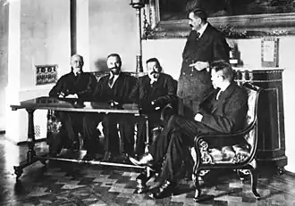 The Council of the People's Deputies after the USPD pulled out on 29 December 1918 (from left to right): Philipp Scheidemann, Otto Landsberg, Friedrich Ebert, Gustav Noske, Rudolf Wissell