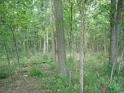 County Farm Park contains the Britton Woods Nature Area, an 18-acre forested area named for Claudius Britton, the last private landowner of what is the modern park who sold the land to the county in 1836. It contains both upland and floodplain tree species, including upland oak, hickory, and cherry trees as well as floodplain maple, ash, ironwood, and hornbeam trees.[1] Numerous species of wildflowers grow in Britton Woods, but the white trillium (Trillium grandiflorum) and Wild Geranium (Geranium maculatum) are the most common. Other native flowers, including Rue anemone (Thalictrum thalictroides), Yellow Violet (Viola pubescens), False Solomon’s Seal (Smilacina racemosa), Bloodroot (Sanguinaria canadensis), and Early Meadow Rue (Thalictrum dioicum), are also part of the ecosystem.[4]
