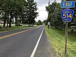 CR 514 begins at an intersection with U.S. Route 202/Route 31 in East Amwell Township, Hunterdon County, heading northeast on two-lane undivided Old York Road. West of US 202/Route 31, Old York Road becomes Route 179. A short distance after beginning, the road becomes the border between Raritan Township to the northwest and East Anwell to the southeast, passing through a mix of farmland and homes. The route reaches the residential community of Reaville, where CR 514 splits from Old York Road and heads northeast onto Amwell Road, with CR 613 continuing along Old York Road. The road comes to the intersection of Manners Road (CR 609) before running east through more areas of agriculture and housing developments.[1][3]