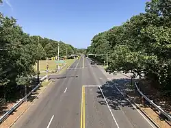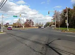 CR 547 heads east for a brief concurrency with four-lane Route 33 after the circle before turning northeast onto four-lane undivided Shafto Road. South of this intersection, Monmouth County maintains Wyckoff Road as a section of CR 547 for 0.45 miles (0.72 km) to Route 34.[3] The road continues into Tinton Falls and passes through a mix of farms and woods before continuing into forested areas with some commercial development. Upon crossing the intersection of Asbury Avenue (CR 16), the road runs between Naval Weapons Station Earle to the west and wooded residential and commercial development to the east. CR 547 passes through dense forests before intersecting with Wayside Road (CR 38) and passing under the Garden State Parkway. The road intersects with Wayside Road (CR 38) again after and enters Eatontown at the intersection of Hope Road (CR 51), where the name becomes Wyckoff Road. A short distance later, the route comes to a partial interchange providing access to and from the southbound direction of the Route 18 freeway before heading into wooded residential neighborhoods. CR 547 widens to a divided highway as it passes the Monmouth Mall and comes to an intersection with Route 36. The road passes more businesses as it becomes undivided and comes to the intersection of Route 35 a short distance later. CR 547 continues past more homes before it reaches an intersection with Broad Street (Route 71).[1][2]