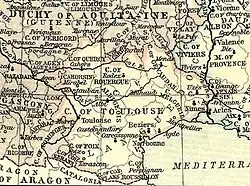 The County of Toulouse (Occitan: Comtat de Tolosa, Latin: Comitatus Tolosanus, Middle French: Conté de Thoulouse) was a territory in present-day southern France consisting of the city of Toulouse and its environs, ruled by the Count of Toulouse from the late 9th century until the late 13th century.[2]