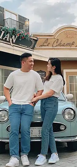 In Korea, the style has come to symbolize a unified relationship of a couple. Its outward physical pairing intentionally shows a couple's commitment to one another and sharing experiences. Couples may wear matching clothes to demonstrate their love and devotion to each other and exemplify togetherness.[1] The clothing trend is generally favored among younger couples as it is a more acceptable public display of affection than kissing.[2] It is also speculated that the trend is so popular in Korea because of the cultural uniformity in society and style.[3] Censorship in Korea is also another factor in which young couples seek to find ways to share intimacy without being persecuted.