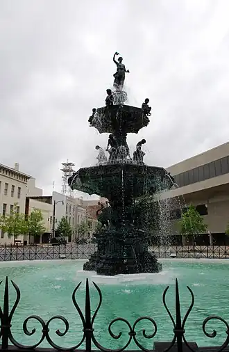 The Court Square Fountain, in the Court Square-Dexter Avenue Historic District of Montgomery, Alabama, was established in 1885 on top of an artesian well, which native Alabamians used long before the area was settled. The fountain contains statues based on Greek mythology. The surrounding area, once the location for Montgomery's bustling slave trade, has seen most of its historical buildings torn down; the fountain's statues were replaced with aluminum ones in the 1980s.
