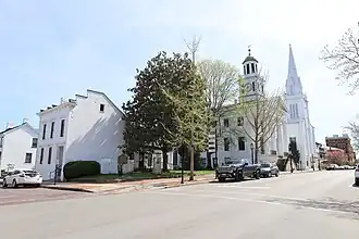 Buildings of the district, including the Old Courthouse and Presbyterian Church in 2023