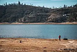 ![]() Courtney Fire fire scar, viewed from the north shore of Bass Lake in 2023. | |